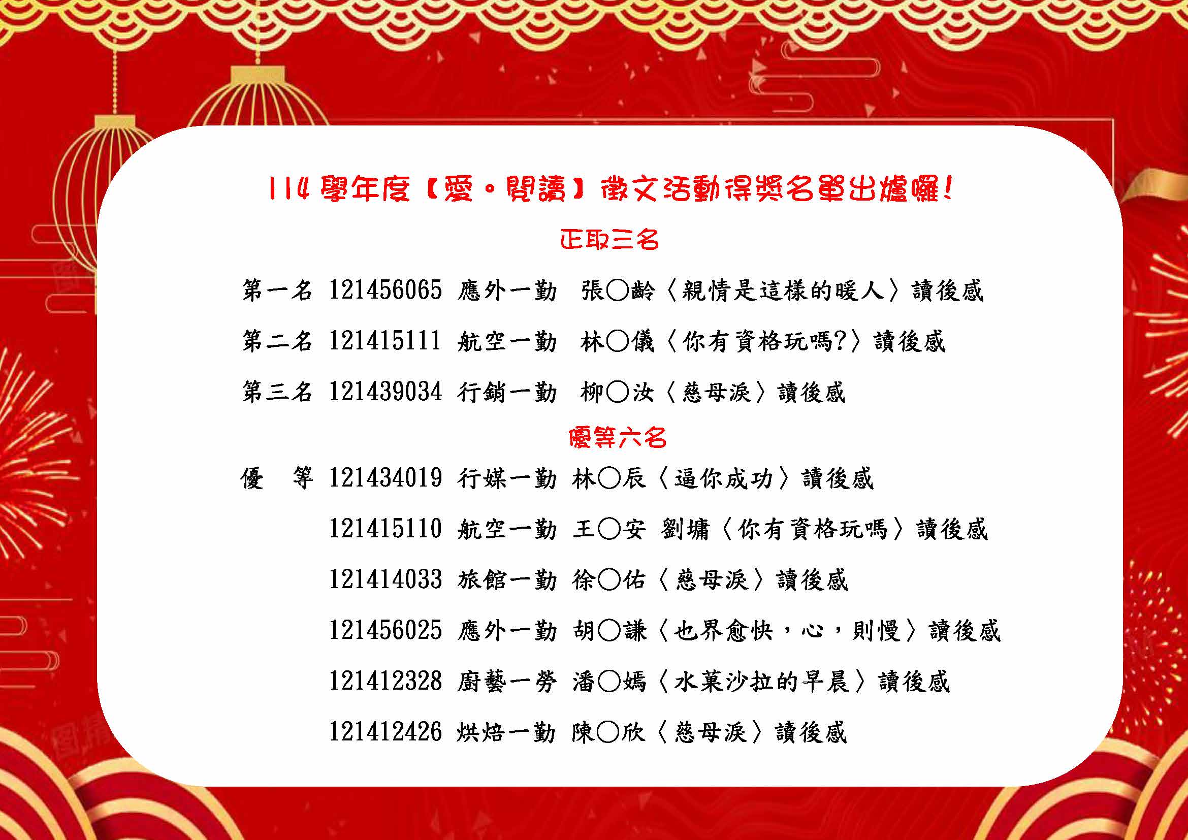 114學年【愛。閱讀】徵文得獎名單公告